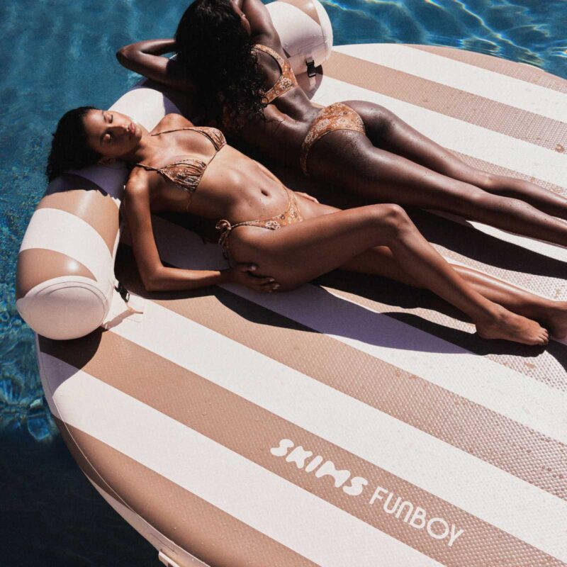 SKIMS and FUNBOY linked up to drop a 14-piece limited edition inflatable collection and it is exactly what you think it is: luxury neutrals, sculptural silhouettes, and that signature SKIMS energy applied to your whole entire pool day. We’re talking Cocoa, Sienna, Cherry Blossom, and that cheetah print you’ve been seeing all over the SKIMS Swim campaign. Head to toe coordinated. Float included.
